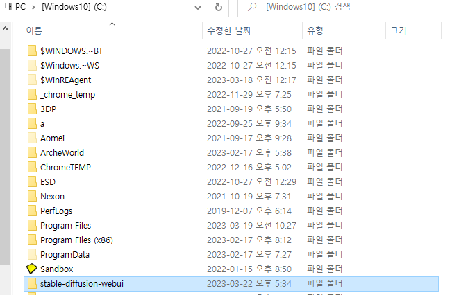 그런 후 C드라이브로 들어가시면 stable-diffusion-webui라고 깔린게 보이실거에요