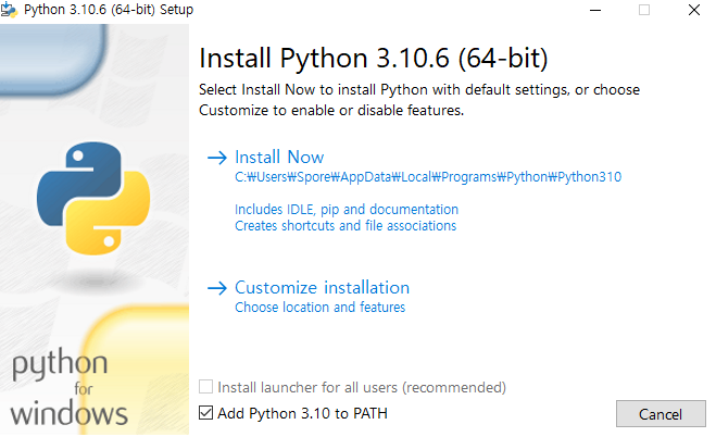 그런 후 Add Python 3.10 to PATH 를 체크 해주세요