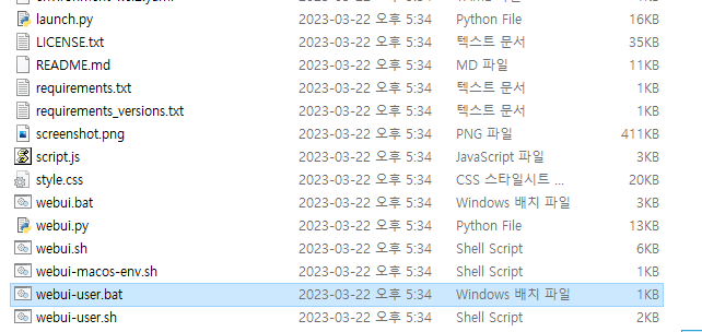 폴더에 들어가서 보시면 webui-user.bat 파일이 있습니다 실행해주세요